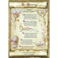 Geschenk zur Silberhochzeit Schenken Sie das schöne Kunstbild mit eigenem Wunschtext zur Silbernen Hochzeit. Es handelt sich um eine Urkunde mit dem Spruch zur Silberhochzeit: " Zur Silberhochzeit Fünfundzwanzig Jahre geben Kraft und Halt im Eheleben. Wir bestaunen aufmerksam Silber-Braut und Bräutigam. Was habt Ihr in all den Jahren an Verdruss und Glück erfahren? Meistens hattet Ihr ja Glück daran denkt Ihr gern zurück…." Den Namen können wir in die obere Zeile (unter der Überschrift) einfügen. Ihren Wunschtext drucken wir in die letzte Zeile. Sie können den Wunschtext einzeilig oder zweizeilig erhalten. Die maximale Textlänge beträgt 30 Zeichen je Zeile. Rahmen zusätzlich erhältlich Optimal kommt die Urkunde in einem entsprechenden Rahmen zur Geltung und kann damit perfekt als Wanddekoration zum Einsatz kommen. Weitere Urkunden mit Sprüchen zu unterschiedlichen Anlässen sind bei uns erhältlich. Geschenk zur Silbernen Hochzeit